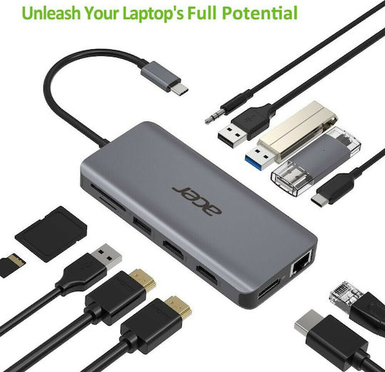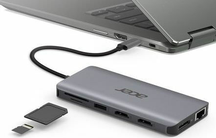 Με το Acer 12-σε-1 USB Type C Docking Station θα έχετε πάντα πρόσβαση στις θύρες που χρειάζεστε. Επιλέξτε DisplayPort ή δύο HDMI όταν συνδέεστε σε τηλεόραση ή οθόνη, συνδέστε έναν σκληρό δίσκο υψηλής ταχύτητας σε μία από τις δύο θύρες USB 3.2 για γρήγορη μεταφορά δεδομένων, το πληκτρολόγιο και το ποντίκι εύκολα με τις θύρες USB 2.0 και μεταφέρετε φωτογραφίες από την κάμερα σας εύκολα με την ενσωματωμένη υποδοχή κάρτας SD.