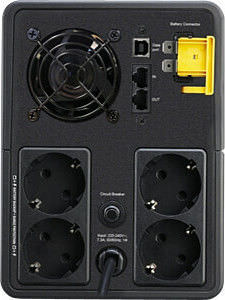 Το Back-UPS 1600VA Line-Interactive 900W με 4 Schuko Πρίζες της APC είναι ένα Tower UPS. Διαθέτει 4 πρίζες τύπου Schuko καθώς και υποδοχή και έξοδο για καλώδιο ethernet προστατεύοντας τις συσκευές που συνδέονται με αυτό π.χ. router (εφόσον είναι συνδεδεμένη και η τροφοδοσία τους σε UPS ή πολύπριζο ασφαλείας). Η λειτουργία του είναι (VI) Line-Interactive που προσαρμόζει την τάση εξόδου συνεχώς μέσω αυτόματου ρυθμιστή τάσης προστατεύοντας από αυξομειώσεις της τάσης και διακοπές του ρεύματος. Η μπαταρία του μπορεί να κρατήσει 7 λεπτά με μισό φορτίο ή 1 λεπτό με πλήρες φορτίο (όταν οι συσκευές που είναι συνδεδεμένες τραβάνε το μισό ή το μέγιστο ρεύμα που μπορεί να δώσει το UPS αντίστοιχα).