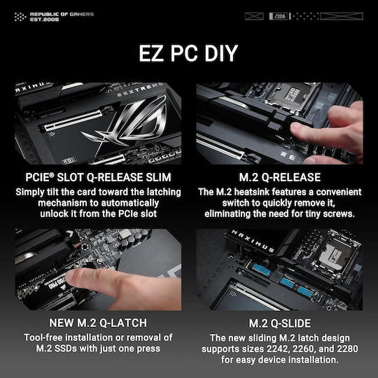 Αγκαλιάζοντας πλήρως το νέο πρότυπο, ο ROG Maximus Z890 Extreme προσφέρει άφθονη υποστήριξη Gen 5 για να παρέχει απεριόριστο εύρος ζώνης στους ταχύτερους διαθέσιμους SSD και κάρτες γραφικών. Και οι δύο υποδοχές επέκτασης x16 προσφέρουν απίστευτες ταχύτητες έως και 64 GB/s για συμβατές συσκευές. Για να αντέξουν το βάρος των ογκωδών καρτών γραφικών, προστατεύονται επίσης με βραχίονες συγκράτησης SafeSlot και οι δύο υποδοχές μπορούν να απελευθερωθούν εύκολα με το PCIe Slot Q-Release Slim.