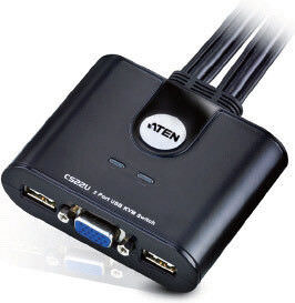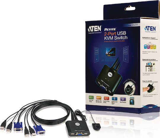 Το CS22U της ATEN είναι ένα 2-Port KVM switch με ενσωματωμένα καλώδια και μπορεί να ελέγχει 2 κεντρικές μονάδες PC από ένα πληκτρολόγιο USB, ένα ποντίκι USB και μια οθόνη VGA.