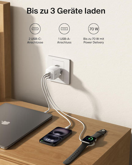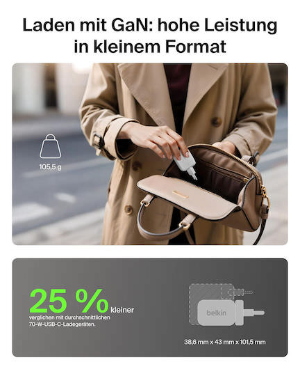 Ο φορητός φορτιστής τοίχου με τροφοδοσία GaN Belkin BoostCharge Pro 3-Port GaN Wall Charger 70W + Travel Adapter Kit συνδυάζει ταχύτητα και αποδοτικότητα. Ειδικά σχεδιασμένος για επαγγελματίες και ταξιδιώτες, προσφέρει ισχύ 70 W και δυνατότητα φόρτισης 3 συσκευών ταυτόχρονα.