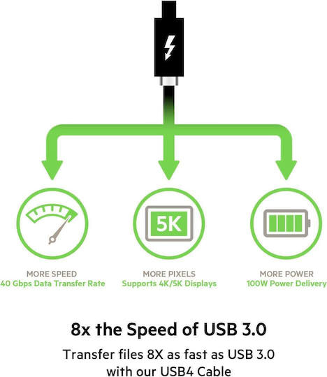 Το μέλλον των USB είναι πλέον εδώ με το καλώδιο USB4. Αποκτήστε πρόσβαση σε ταχύτητες έως και 40Gbps απολαμβάνοντας το απαραίτητο εύρος ζώνης για κορυφαίες αναλύσεις βίντεο, παροχή ισχύος και γρήγορη μεταφορά δεδομένων, όλα ταυτόχρονα με ένα μόνο καλώδιο. Είναι συμβατό με καλώδια προηγούμενης τεχνολογίας, υποστηρίζοντας τα USB Type-C, USB 3.2, USB 2.0 και Thunderbolt 3.