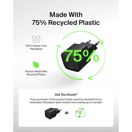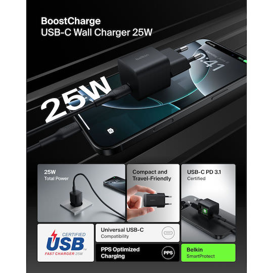 Belkin Φορτιστής Χωρίς Καλώδιο με Θύρα USB-C 25W Power Delivery Μαύρος (BOOST Charge)
