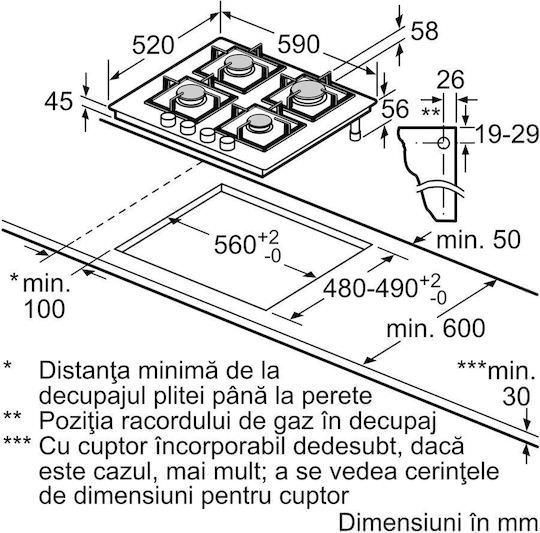 4 εστίες αερίου, διάταξη 60cm