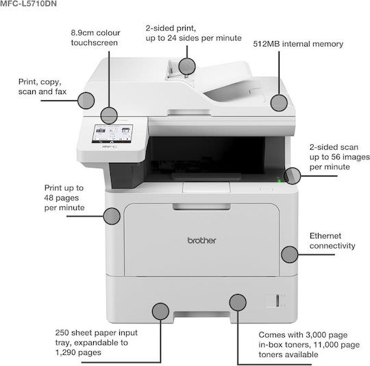 Με το πολυμηχάνημα MFC-L5710DN της Brother θα μπορέσετε να κάνετε τα πάντα, όπως εκτύπωση, σάρωση και αντιγραφή. Χρησιμοποιεί τεχνολογία laser και μπορεί να τυπώσει μόνο ασπρόμαυρα. Μέσω καλωδίου ethernet έχει τη δυνατότητα να συνδεθεί στο δίκτυό σας και έτσι να μπορέσετε να εκτυπώσετε από όποιονδήποτε υπολογιστή από απόσταση, χωρίς να χρειάζεται η σύνδεση μέσω καλωδίου USB.