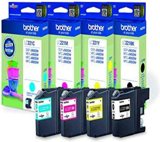 Brother LC221 Γνήσιο Πακέτο 4 Μελανιών Εκτυπωτή InkJet Κίτρινο / Κυανό / Ματζέντα / Μαύρο (LC-221VALBP)