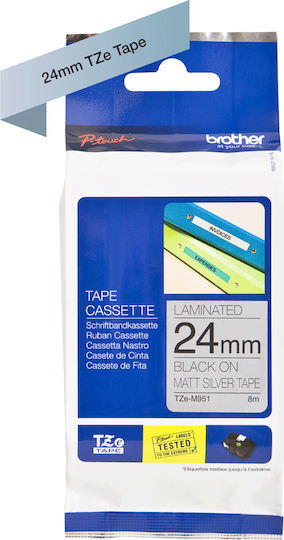 Η ταινία ετικετογράφου TZe-M951 έχει δοκιμαστεί αυστηρά από την Brother για να διασφαλιστεί η ανθεκτικότητα και η αξιοπιστία της. Αυτή η κασέτα ετικετών 24mm σε μαύρο χρώμα με μεταλλική ματ ασημί επιφάνεια είναι ιδανική για τη σύνταξη ετικετών που προσδιορίζουν τον εξοπλισμό που καταγράφεται στο μητρώο στοιχείων εντός του οργανισμού σας. Είναι επίσης τέλεια για τη χρήση σε ελέγχους ηλεκτρικής ασφάλειας, για να εμφανίζεται πότε έγινε η πιο πρόσφατη δοκιμή και πότε είναι προγραμματισμένη η επόμενη. Με σχέδιο ανθεκτικό στο νερό, κόλλα που κολλά σε σχεδόν κάθε επιφάνεια και τεχνολογία αντοχής στο ξεθώριασμα, η ταινία και το κείμενό σας θα παραμείνουν ανέπαφα στις πιο ακραίες συνθήκες. Επιπλέον, με την επιφάνεια της TZe-M951 να έχει ματ φινίρισμα, δεν υπάρχει κίνδυνος αντανάκλασης που να θολώνει το κείμενο. Επιλέγοντας την αυθεντική ταινία ετικετογράφου Brother TZe-M951, διασφαλίζετε ότι ο εκτυπωτής P-touch σας συνεχίζει να παρέχει αποτελέσματα που είναι καθαρά, ευανάγνωστα και σχεδιασμένα για να διαρκούν.