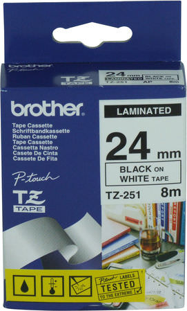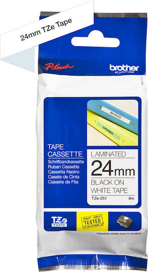 Ταινία ετικετογράφου Brother TZe-251, κατάλληλη για ετικέτες με μαύρο κείμενο σε λευκό φόντο. Έχει πλάτος 24mm.