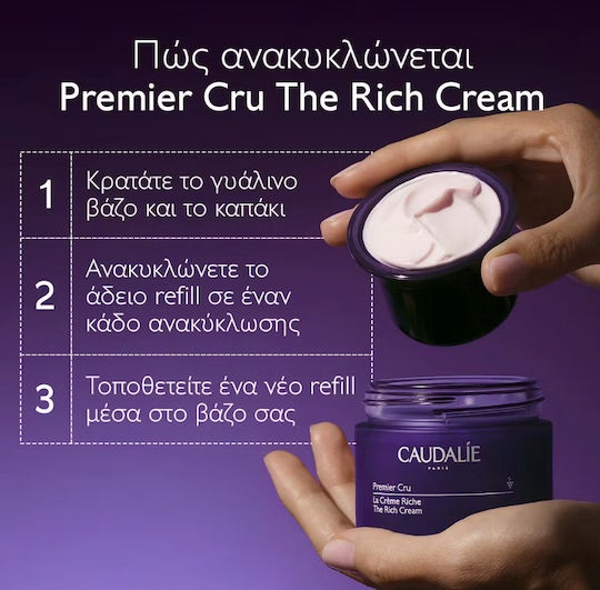 Η Caudalie έχει δεσμευτεί να κάνει την ομορφιά να συμβαδίζει με τη βιωσιμότητα. Μπορείτε να χρησιμοποιήσετε τις κάψουλες για να ξαναγεμίσετε εύκολα το βαζάκι της The Premier Cru Rich Cream.