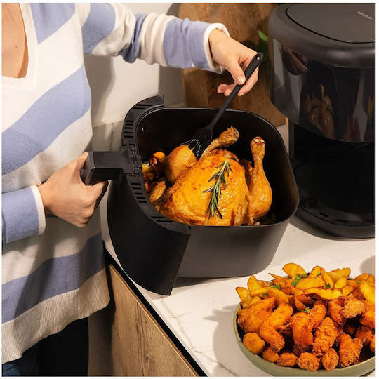 Μια φριτέζα αέρος μπορεί να λύσει τα χέρια στην κουζίνα και να κάνει το καθημερινό μαγείρεμα εύκολο και προσιτό, ακόμη και σε όποιον δεν έχει ασχοληθεί ξανά. Το βασικό της πλεονέκτημα είναι ότι διατηρεί αναλλοίωτη τη γεύση και την υφή των φαγητών, αλλάζοντας απλά τον τρόπο που μαγειρεύει αγαπημένα γεύματα. Θα μπορείτε και πάλι να απολαύσετε τραγανές κοτομπουκιές και πατάτες “τηγανιτές”, χωρίς όμως να είναι στην πραγματικότητα τηγανιτές, χάρη στην τεχνολογία του αέρα, που ακόμη και με μια κουταλιά λάδι, είτε χωρίς προσθήκη αυτού, διατηρεί την τραγανότητα και απομακρύνει την υγρασία των τροφίμων.Επιπλέον, πρόκειται για μια πολύ συμπαγή συσκευή, που καταλαμβάνει ελάχιστο χώρο στον πάγκο σας και μπορεί να χρησιμοποιηθεί τόσο για μαγείρεμα, όσο και για ζέσταμα γευμάτων.
