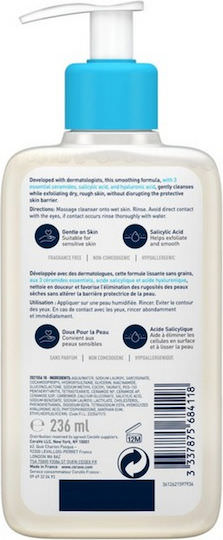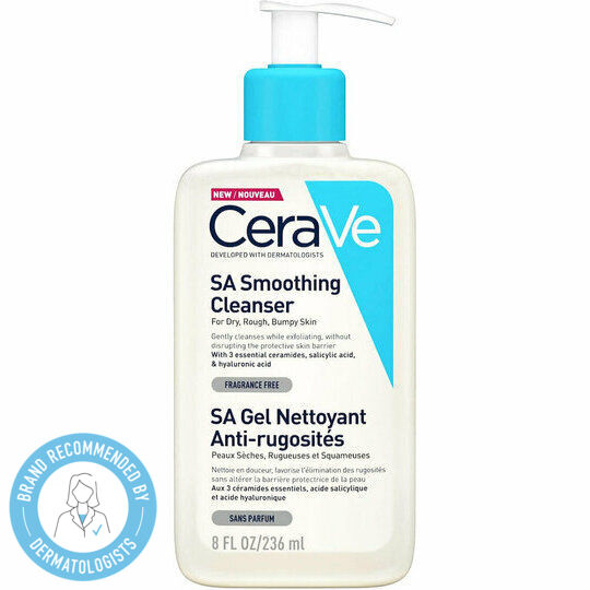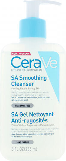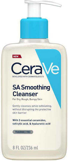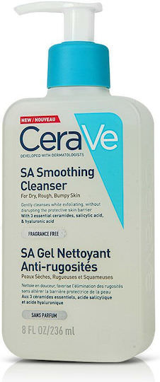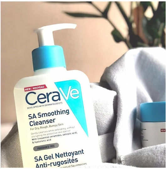 CeraVe SA Smoothing Cleanser για πρόσωπο και σώμα, κατάλληλο για καθημερινή χρήση. Ένα τζελ καθαρισμού που βελτιώνει το τραχύ και ανομοιόμορφο δέρμα, δίνοντάς του πιο λεία υφή.