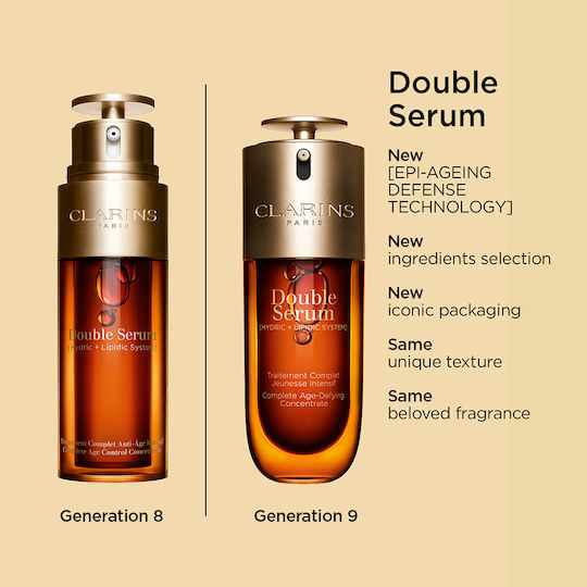 Το Double Serum είναι μια καινοτόμος λύση κατά της γήρανσης με επαναστατημένη σύνθεση. Η διπλή φόρμουλα του περιλαμβάνει 95% συστατικά φυσικής προέλευσης και συνδυάζει 22 ισχυρά φυτικά εκχυλίσματα, όπως το εκχύλισμα κουρκουμά, με 5 νέα καθαρά ενεργά μόρια που τονώνουν τις ζωτικές λειτουργίες του δέρματος.