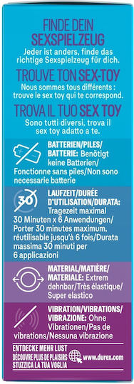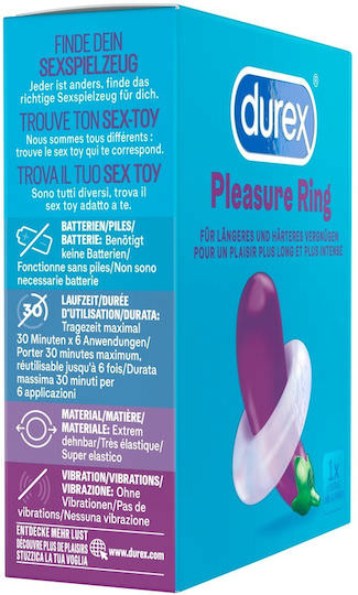 Το νέο Δαχτυλίδι Στύσης Durex είναι σχεδιασμένο για να βοηθά στη διατήρηση στυτικής ικανότητας για μεγαλύτερη διάρκεια και να εντείνει τη ευχαρίστηση και των δύο. Είναι πολύ ελαστικό και μαλακό, επαναχρησιμοποιούμενο και μπορεί να χρησιμοποιηθεί έως 6 φορές. Συνιστάται η χρήση του δαχτυλιδιού να περιορίζεται σε 30 λεπτά ανά χρήση.
