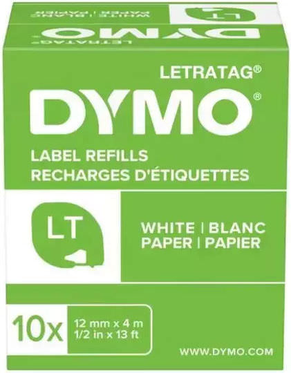 Αυτοκόλλητες ταινίες κατάλληλες για ηλεκτρονικούς ετικετογράφους χειρός σε λευκό χρώμα της εταιρείας Dymo. Περιλαμβάνει 1 ρολό με μήκος 4 μέτρα και πλάτος 12 χιλιοστά.