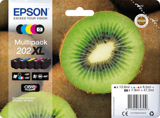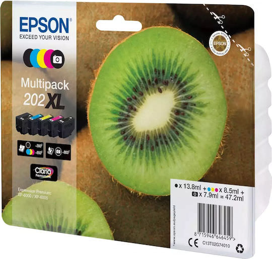 Epson 202XL Γνήσιο Πακέτο 5 Μελανιών Εκτυπωτή InkJet Photo Μαύρο / Κίτρινο / Κυανό / Ματζέντα / Μαύρο (C13T02G74010)