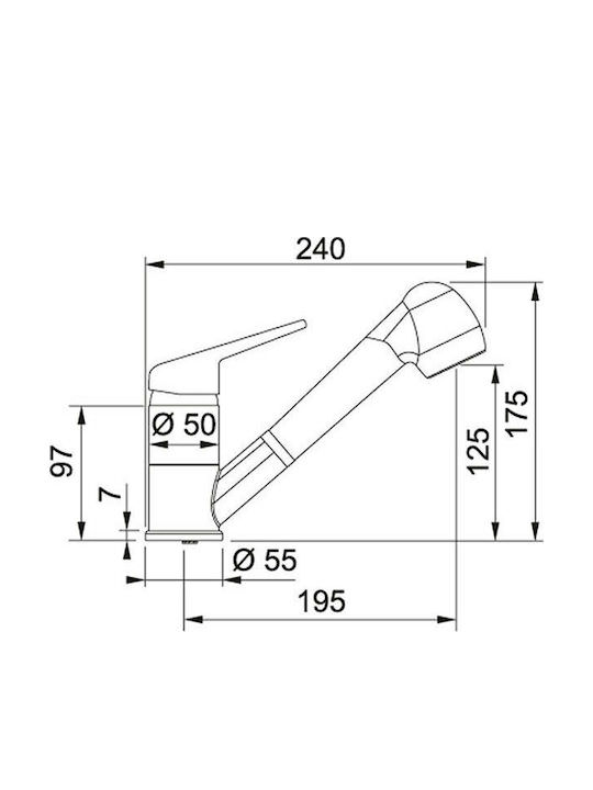 Μοντέρνα χαμηλή μπαταρία κουζίνας με αποσπώμενο ντους 2 εξόδων, χρήσιμο για πλύσιμο των μαγειρικών σκευών ή φρούτων και λαχανικών. Διαθέτει μονό χερούλι για ρύθμιση της θερμοκρασίας και πίεσης του νερού και αποσπώμενο ντουζ με 2 λειτουργίες (κανονική και σπρέι).