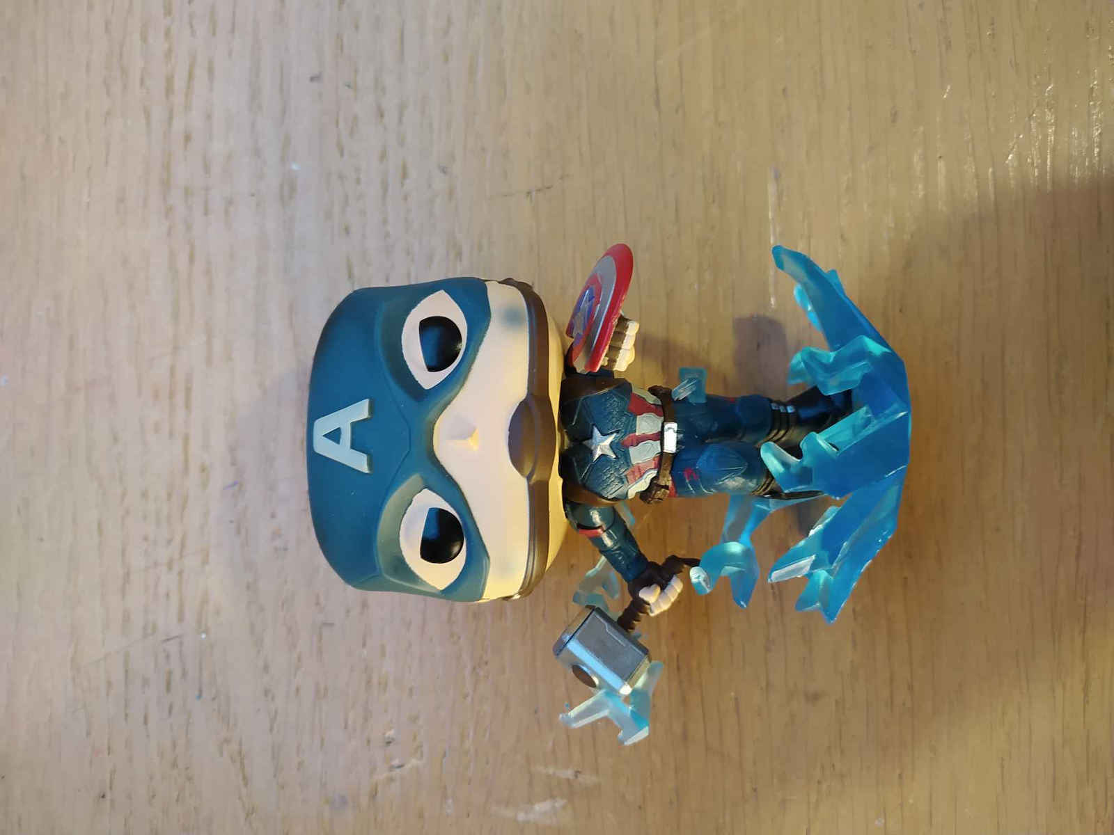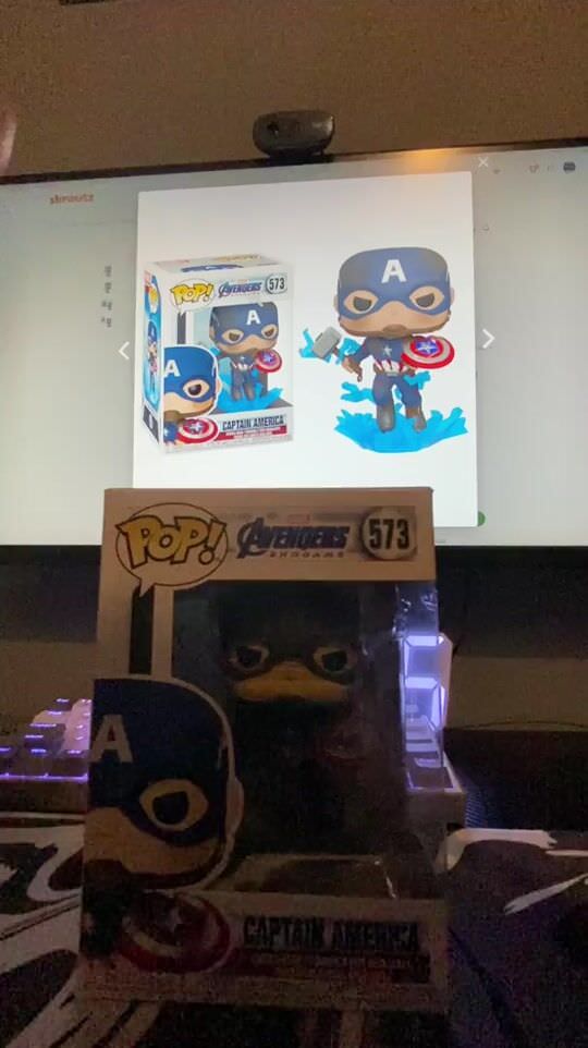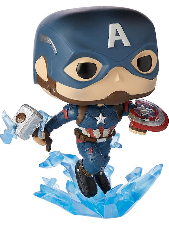 Η Funko Pop! απεικονίζει τον Captain America (Steve Rogers) από την επική τελική μάχη του Avengers: Endgame, τη στιγμή που αποδεικνύεται άξιος και σηκώνει το σφυρί του Θορ, τον Mjolnir. Ο Cap κρατάει τον Mjolnir, ενώ το θρυλικό του αδαμάντινο σπασμένο ασπίδα βρίσκεται στο άλλο του χέρι.