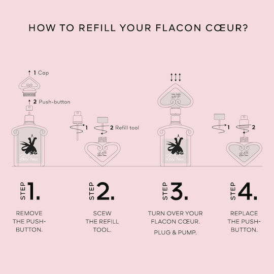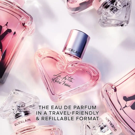 Το εμβληματικό άρωμα La Petite Robe Noire eau de parfum της Guerlain έχει εμπνεύσει ένα ρευστό, επαναγεμιζόμενο μπουκάλι σε σχήμα καρδιάς, φιλικό προς το ταξίδι: Flacon Coeur. Η ροζ είναι η καρδιά του αρώματος La Petite Robe Noire. Μια βαθιά, μυστήρια και ατελείωτα πολυδιάστατη ροζ, κεντημένη με τις καλύτερες μαύρες νότες στην αρωματοποιία.
