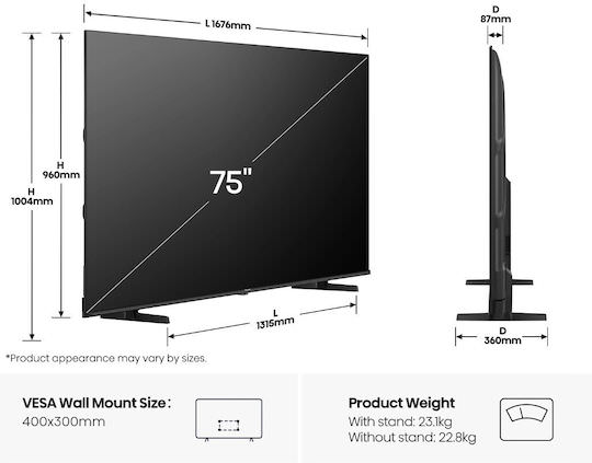 Αυτή η τηλεόραση διαθέτει μία εντυπωσιακή διάμετρο 75 ιντσών, ιδανική για να απολαμβάνεις ταινίες και προγράμματα σε μεγάλες διαστάσεις. Η τεχνολογία QLED που χρησιμοποιεί εξασφαλίζει ευρύτερο φάσμα χρωμάτων και μεγαλύτερη φωτεινότητα, προσφέροντας μια μοναδική εμπειρία θέασης. Όσον αφορά την ποιότητα εικόνας, η τηλεόραση υποστηρίζει ανάλυση 4K Ultra HD, παρέχοντας εκπληκτική ευκρίνεια με 3840×2160 pixels.
