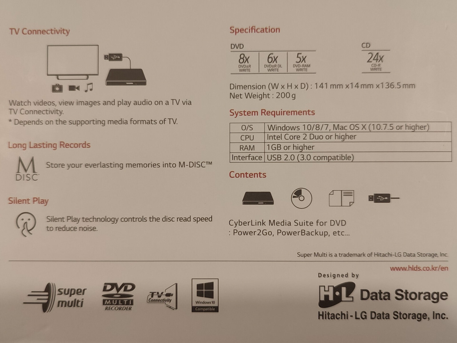 – Ταχύτητα ανάγνωσης: DVD-R/RW/ROM – 8x/8x/8x max, DVD-R DL – 8x max, DVD-RAM (Ver.2.2) – 6x max, DVD-Video – 4x max, M-DISC (DVD+R SL) – 8x CAV, DVD+R/+RW – 8x/8x max, DVD+R DL – 8x max, CD-R/RW/ROM – 24x/24x/24x max, CD-DA – 24x max.