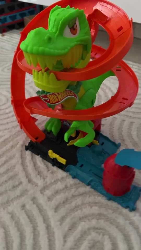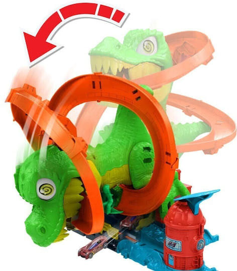 Χρησιμοποιήστε επικές αγωνιστικές δεξιότητες για να προστατέψετε το Hot Wheels City από ένα δυναμικό T-Rex που θέλει να φάει όλα τα αυτοκίνητα! Τα παιδιά λανσάρουν το συμπεριλαμβανόμενο όχημα σε κλίμακα 1:64 και κάνει ζουμ γύρω από το dino με τρία πιθανά αποτελέσματα: να φαγωθεί και να βγει έξω, να χτυπήστε μια παράκαμψη για ανεφοδιασμό καυσίμων ή να κατακτήστε το θηρίο και να σώσετε φίλους. Κάθε φορά που τα αυτοκίνητα περνούν με φόρα, τα μάτια του T-Rex γυρίζουν και τα χέρια τρέμουν μέχρι τελικά να καταρρεύσει! Υπάρχει αποθηκευτικός χώρος για πρόσθετα αυτοκίνητα και λεπτομέρειες παιχνιδιού με ώθηση για ανοιχτή αφήγηση. Τα χρώματα και τα διακοσμητικά μπορεί να διαφέρουν.