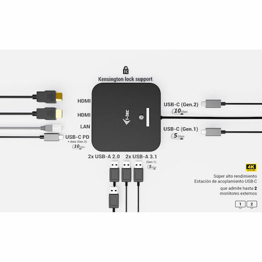 i-tec USB-C Docking Station με HDMI 4K PD Ethernet και σύνδεση 2 Οθονών Μαύρο (C31DUALHDMIDPD100)