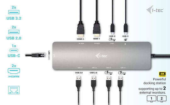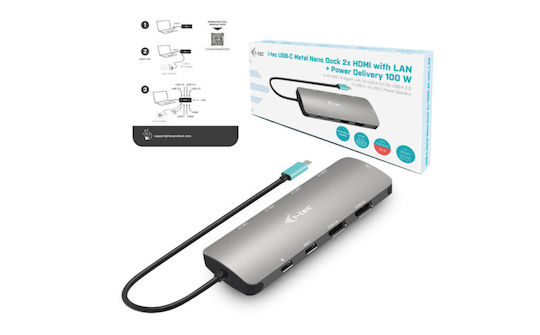 i-tec USB-C Metal Nano USB-C Docking Station με HDMI 4K PD Ethernet και σύνδεση 2 Οθονών Γκρι