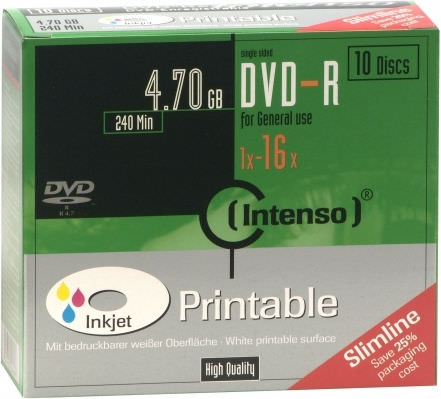 Εγγράψιμα DVD σε συσκευασία 10 τεμαχίων της εταιρείας Intenso για την αποθήκευση δεδομένων, φωτογραφιών, ταινιών ή μουσικής. Τα DVD-R δεν σβήνονται καθώς η εγγραφή τους επιτρέπεται μία φορά μόνο. Δεν έχει ιδιαίτερες διαφορές από το DVD+R. Με δυνατότητα εκτύπωσης στην επιφάνεια του, χωρίς να επηρεάζεται η σωστή λειτουργία του. Συμβατό μόνο με εκτυπωτές που διαθέτουν αυτή τη δυνατότητα.