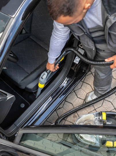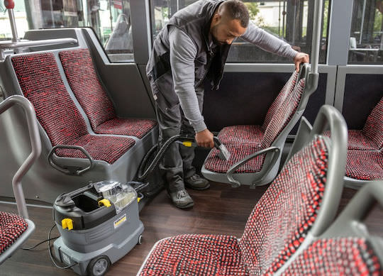 Η ειδική μηχανή καθαρισμού για ταπετσαρίες, καθώς και για αφαίρεση λεκέδων σε υφασμάτινες επιφάνειες: μηχανή πλύσης απόπλυσης υφασμάτινων επιφανειών Puzzi 8/1 με εργονομικό, ιδιαίτερα κοντό ακροφύσιο ταπετσαρίας.