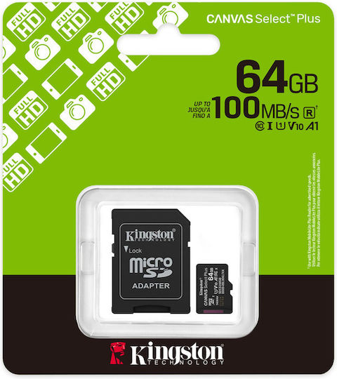Kingston Canvas Select Plus microSDHC 64GB Class 10 U1 V10 A1 UHS-I με αντάπτορα