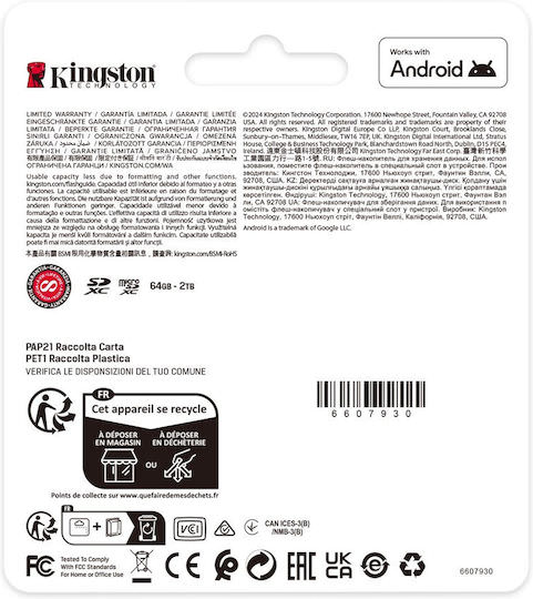 Η κάρτα μνήμης Canvas Select Plus microSD της Kingston είναι συμβατή με συσκευές Android και έχει σχεδιαστεί για βελτιωμένη απόδοση με βαθμολογία A1. Προσφέρει αξιόπιστη ταχύτητα και μεγάλες χωρητικότητες για γρηγορότερη φόρτωση εφαρμογών και καταγραφή εικόνων και βίντεο, με χωρητικότητα έως 1TB. Ικανή να διασφαλίσει την απόδοση, την ταχύτητα και την ανθεκτικότητα, η κάρτα Canvas Select Plus microSD είναι σχεδιασμένη για αξιοπιστία, ώστε να μπορεί να χρησιμοποιείται οπουδήποτε με την βεβαιότητα ότι οι φωτογραφίες, τα βίντεο και τα αρχεία σας θα είναι ασφαλή.