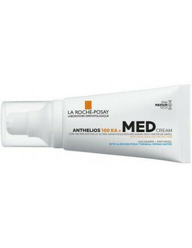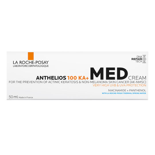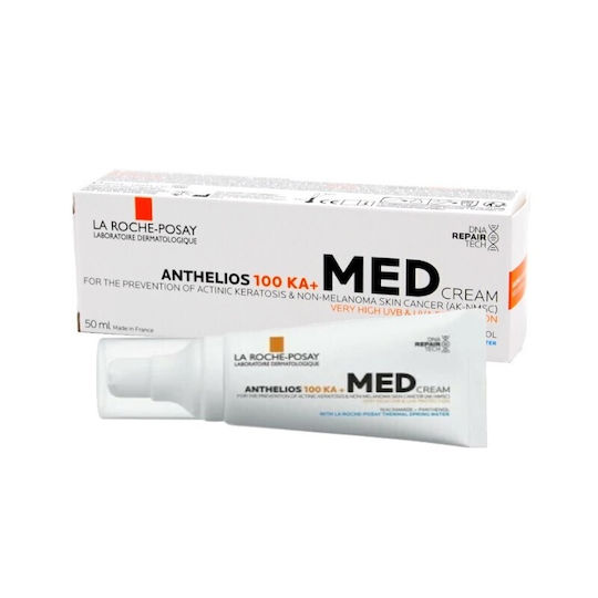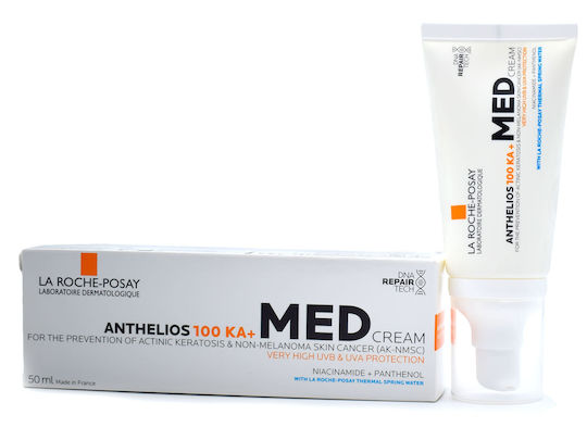 Το La Roche Posay Anthelios 100 KA+ Med Cream είναι ένα ιατροτεχνολογικό προϊόν που προστατεύει τα φωτοευαίσθητα δέρματα από την ανάπτυξη ακτινικής υπερκεράτωσης (ΑΚ) και μη μελανωματικού καρκίνου του δέρματος (NMSC). Παρέχει πολύ υψηλή και ευρέως φάσματος προστασία από τη UVA & UVB ακτινοβολία, χάρη σε ένα κατοχυρωμένο με δίπλωμα ευρεσιτεχνίας και φωτοσταθερό σύστημα φίλτρων, συμπεριλαμβανομένου του Mexoryl. Η ενυδατική του σύνθεση, με Τεχνολογία Αποκατάστασης DNA, είναι εμπλουτισμένη με Νιασιναμίδη και Πανθενόλη.