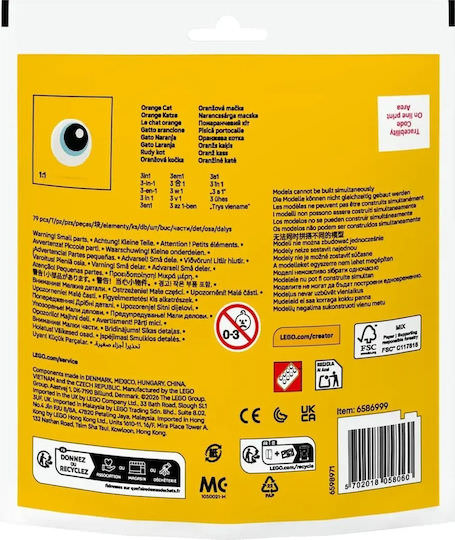 Η σειρά LEGO Creator 3-in-1 προσφέρει μια μοναδική ευκαιρία για δημιουργικό παιχνίδι, ενθαρρύνοντας τις φαντασίες των μικρών κατασκευαστών. Με 79 τουβλάκια, θα μπορέσεις να συνδυάσεις τα κομμάτια και να φτιάξεις έναν εντυπωσιακό πορτοκαλί γάτο, αλλά και άλλες μοναδικές κατασκευές όπως οχήματα και ζώα, ανάλογα με τη φαντασία σου. Αυτά τα τουβλάκια είναι φτιαγμένα από ασφαλές πλαστικό, ιδανικό για παιδιά άνω των 6 ετών.