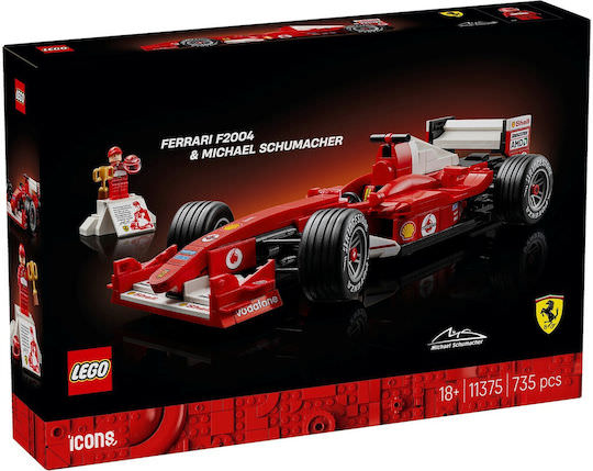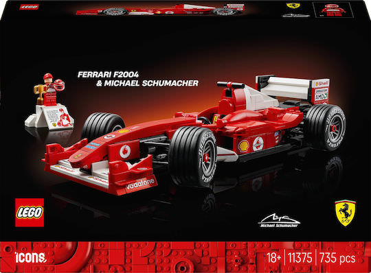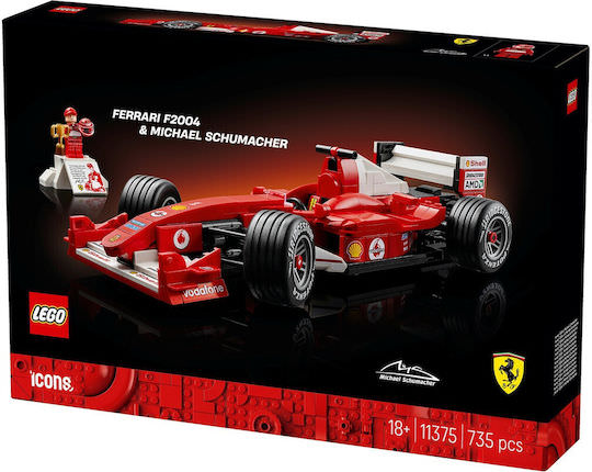 Γιορτάστε μια χρυσή εποχή των αγώνων Formula 1 με το σετ μοντέλου αυτοκινήτου LEGO® Icons Ferrari F2004 & Michael Schumacher (11375). Δημιουργήστε ένα υπό κλίμακα αντίγραφο του θρυλικού αγωνιστικού αυτοκινήτου που, με τον Michael Schumacher στο τιμόνι, κυριάρχησε στην αγωνιστική σεζόν του 2004. Το μοντέλο Ferrari διαθέτει λειτουργικό τιμόνι, λεία ελαστικά με αυλακώσεις και λεπτομερή κινητήρα V10, καθώς και βάση έκθεσης με λεπτομέρειες και στατιστικά στοιχεία για το όχημα. Η μίνι φιγούρα του Michael Schumacher διαθέτει κράνος, τρόπαιο νικητή και βάση έκθεση σε στυλ βάθρου με μια τυπωμένη εικόνα και μια φράση από τον επτά φορές παγκόσμιο πρωταθλητή. Αυτό το κορυφαίο μοντέλο είναι εντυπωσιακό διακοσμητικό και εξαιρετικό δώρο γιορτών ή γενεθλίων για τους λάτρεις των αγώνων F1 και τους συλλέκτες αντικειμένων F1 Ανακαλύψτε τη δυναμική σειρά των σετ κατασκευής LEGO F1 (πωλούνται χωριστά), που έχει σχεδιαστεί για ενήλικες, παιδιά και οικογένειες. Κατασκευάστε πιο έξυπνα με την εφαρμογή LEGO Builder – ζουμάρετε, περιστρέψτε σε 3D, παρακολουθήστε την πρόοδό σας και ακολουθήστε αναλυτικές ψηφιακές οδηγίες. Το σετ περιέχει 735 τεμάχια.