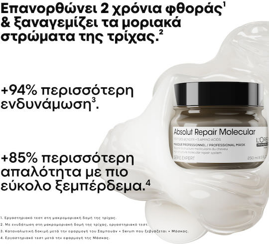 Στην επόμενη επίσκεψή σας στο κομμωτήριο, ζητήστε από τον κομμωτή σας το πρωτόκολλο μοριακής επανόρθωσης μακράς διάρκειας**** με την Absolut Repair Molecular για να επανορθώσετε τη φθορά 2 χρόνων με μία χρήση*. Για πιο δυνατά μαλλιά, με επαναφορά της ελαστικότητας και της κίνησης*****.