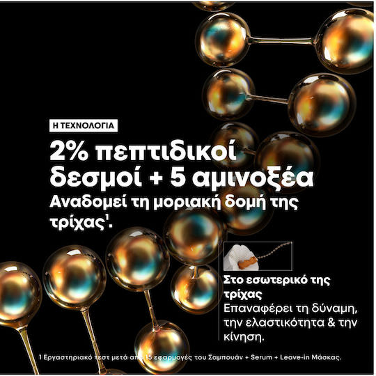 Αυτή η συμπυκνωμένη μάσκα, εμπλουτισμένη με 2% πεπτιδικούς δεσμούς + 5 αμινοξέα, επανορθώνει 2 χρόνια φθοράς* και ξαναγεμίζει τα μοριακά στρώματα της τρίχας****.