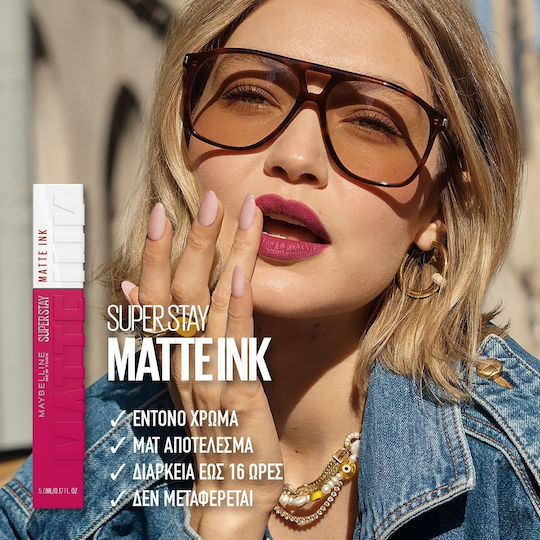 Το Maybelline Superstay Matte Ink είναι ένα υγρό κραγιόν που ξεχωρίζει για την εξαιρετικά μεγάλης διάρκειας φόρμουλά του, η οποία μπορεί να διατηρηθεί αναλλοίωτη έως και 16 ώρες. Η υφή του απλώνεται ομοιόμορφα στα χείλη, προσφέροντας πλήρη κάλυψη και σταθερό, ματ τελείωμα που δεν μεταφέρεται και δεν μουτζουρώνει.
