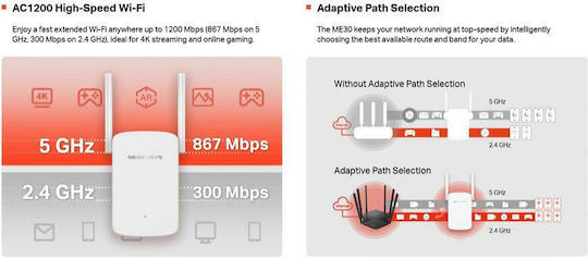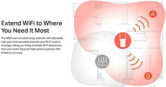 To Wi-Fi ME30 AC1200 αποτελεί ιδανική λύση για την επέκταση της ασύρματης κάλυψης του σπιτιού σας. Εξαλείφει αποτελεσματικά τις νεκρές ζώνες Wi-Fi, εξασφαλίζοντας ισχυρό και αξιόπιστο σήμα σε περιοχές που προηγουμένως είχαν κακή συνδεσιμότητα. Χρησιμοποιώντας τεχνολογία διπλής ζώνης AC1200, το ME30 προσφέρει εντυπωσιακές ταχύτητες έως 867 Mbps στη ζώνη των 5 GHz και 300 Mbps στη ζώνη των 2.4 GHz, φτάνοντας συνολικά τα 1200 Mbps για απρόσκοπτες διαδικτυακές δραστηριότητες.