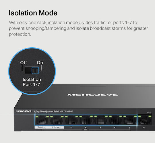 Με ένα μόνο κλικ, η λειτουργία απομόνωσης διαιρεί την κυκλοφορία για τις θύρες 1-7 για να αποτρέψει την κατασκοπεία/παρενόχληση και να απομονώσει τις καταιγίδες εκπομπής για μεγαλύτερη προστασία.