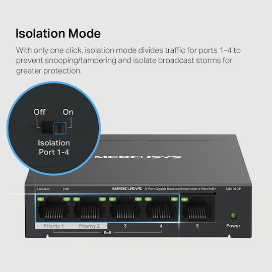 Με ένα μόνο κλικ, η λειτουργία απομόνωσης χωρίζει την κυκλοφορία για τις θύρες 1-4 για να αποτρέψει την κατασκοπεία/παρενόχληση και να απομονώσει τις καταιγίδες εκπομπής για μεγαλύτερη προστασία.