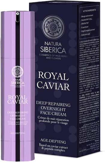 Η κρέμα προσώπου Natura Siberica Royal Caviar Deep Repairing Overnight Face Cream 50ml περιέχει πολύτιμο εκχύλισμα χαβιαριού beluga και το πεπτίδιο SYN®-COLL. Αυτά τα συστατικά προσφέρουν βαθιά διεισδυτική δράση, τροφοδοτώντας το δέρμα με πολύτιμες πρωτεΐνες, μέταλλα και ιχνοστοιχεία.
