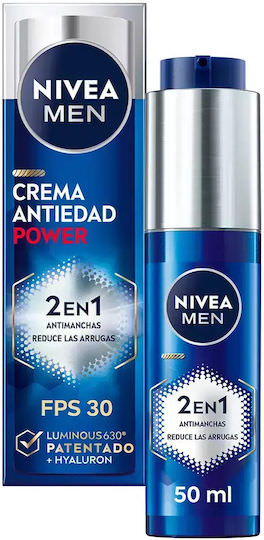 Κρέμα Ημέρας Nivea MEN Power Anti-Aging Moisturizer 2 σε 1 σχεδιασμένη για απαιτητικούς άνδρες που φροντίζουν την εικόνα και αναζητούν τρόπους να αναδείξουν την ομορφιά τους. Συνδυάζει το υαλουρονικό οξύ με το πατενταρισμένο συστατικό κατά των κηλίδων Luminous630®, προσφέροντας ταυτόχρονα αντηλιακή προστασία με FP30 και αντιγηραντική δράση.