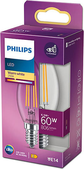 Philips Λάμπα LED 6.5W για Ντουί E14 και Σχήμα B35 Θερμό Λευκό 806lm
