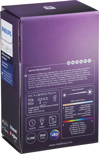 Η Hue Lightstrip Plus Base, με μήκος ενός μέτρου, μπορεί να συνδεθεί με την Hue Lightstrip Plus με Bluetooth, η οποία έχει τη δυνατότητα επέκτασης έως 10 μέτρα. Μετά τη σύνδεση, αποκτά όλες της τις δυνατότητες όπως σύνδεση με smartphone και tablet, αλλά και φωνητικό έλεγχο μέσω του Google Home ή της Alexa.