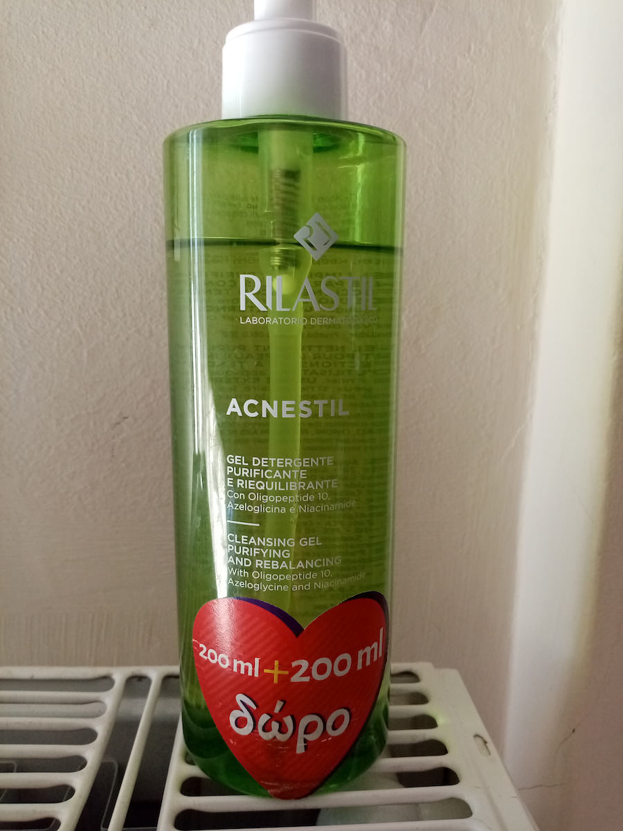 Καθαριστικό προσώπου σε μορφή gel Rilastil Acnestil Cleansing gel. Ειδικά σχεδιασμένο για τις λιπαρές και μικτές επιδερμίδες με τάση προς ήπια ή μέτρια ακμή. Είναι πλούσιο σε σαλικυλικό νάτριο και πανθενόλη (προβιταμίνη Β5) που προσφέρουν μαλακτική δράση και εμπλουτισμένο με ολιγοπεπτίδια και υαλουρονικό οξύ για την καθημερινή θρέψη της επιδερμίδας.
