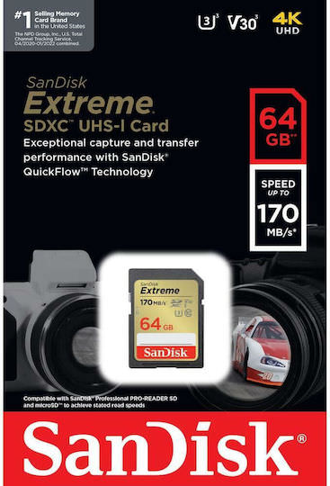 Με την κάρτα μνήμης SanDisk Extreme SD UHS-I εξοικονομήστε χρόνο για τη μεταφορά μέσων με ταχύτητες ανάγνωσης 170MB/s χάρη στην τεχνολογία SanDisk® QuickFlow™ Technology. Συνδυάστε τη με τις κάρτες SanDisk Professional PRO-READER SD και microSD για να επιτύχετε μέγιστες ταχύτητες (πωλούνται ξεχωριστά). Με ταχύτητες λήψης  80MB/s και εγγραφή ταχύτητας UHS Class 3 (U3), είστε έτοιμοι να καταγράψετε βίντεο 4K UHD υψηλής ανάλυσης, χωρίς τραυματισμούς. Επιπλέον, είναι κατασκευασμένη για να αντέχει στις καιρικές συνθήκες, το νερό, τους κραδασμούς και άλλες συνθήκες που δεν είναι και τόσο ιδανικές, ώστε να είστε σίγουροι ότι είναι έτοιμη να πάει όπου κι αν πάτε.
