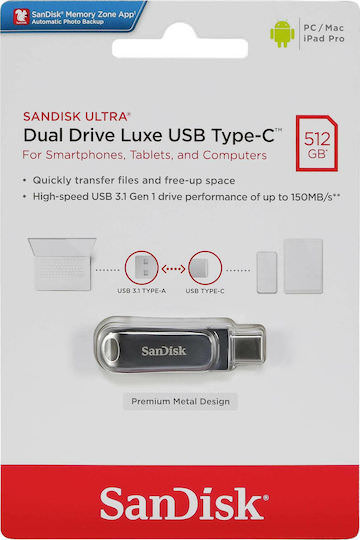Sandisk Ultra Dual Drive Luxe 512GB USB 3.1 Stick με σύνδεση USB-C & USB-A Ασημί