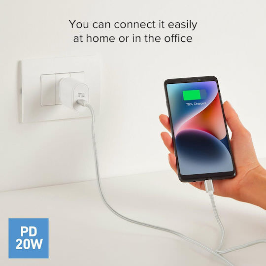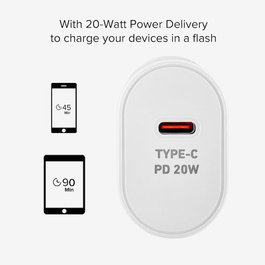 Ο φορτιστής παροχής ισχύος 20W είναι ένα πρακτικό αξεσουάρ ιδανικό για καθημερινή χρήση. Στο σπίτι ή στο γραφείο, αυτός ο συμπαγής φορτιστής μπορεί να μεταφερθεί οπουδήποτε. Συνδέστε το καλώδιο USB-C της συσκευής σας στον φορτιστή για να φορτίσετε αμέσως το smartphone ή το tablet σας.