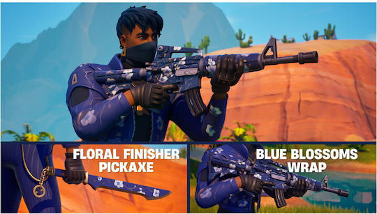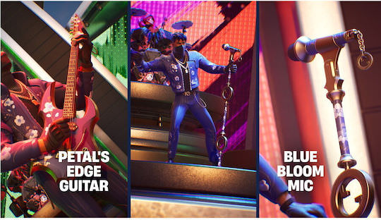 Επιλεγμένα cosmetics: Florin Outfit σε στυλ LEGO, Σακίδιο Blossom, Αξίνα Floral Finisher, Wrap Blue Blossoms, κιθάρα Petal’s Edge, μικρόφωνο Blue Bloom, Kicks Petal Steppers.