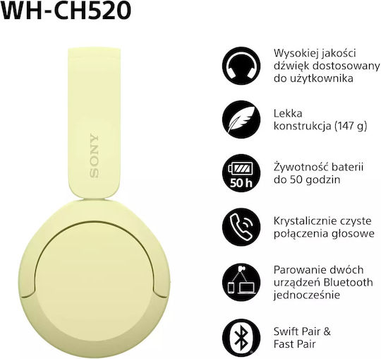 Sony WH-CH520 Ασύρματα Bluetooth On Ear Ακουστικά με 50 ώρες Λειτουργίας και Quick Charge Κίτρινα